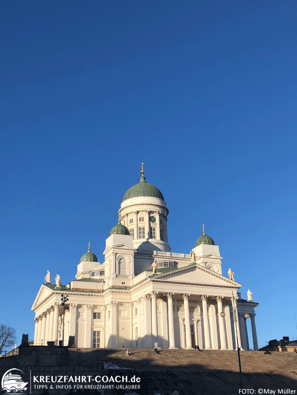 Zu den absoluten „Must-Sees“ zählt natürlich die weiße Domkirche am „Senaatintori“, (auf finnisch: „Tuomiokirkko“) dem Platz des Senators. Sie ist schon bei der Einfahrt in den Hafen (zumindest für Kreuzfahrer zum Südhafen und zum Katajanokka-Hafen) gut zu sehen und erstrahlt bei Sonnenschein majestätisch auf einer Anhöhe. Der große Platz am Fuße der Treppe wird im Sommer häufig für coole Events genutzt, z.B. für Pop-up-Restaurants oder Food-Festivals. Außerdem gelangt man vom Platz aus auf die „Aleksanterin katu“, eine der wichtigsten Einkausstraßen der Stadt.
