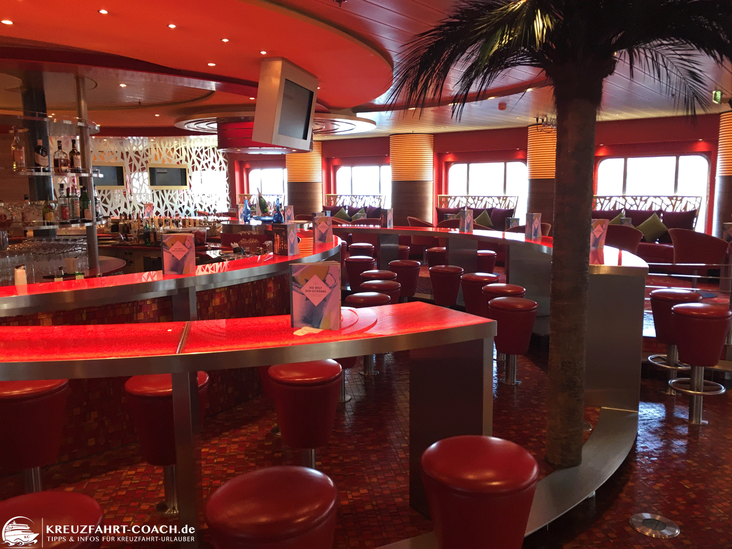 Deck 10 vorne – Die gibt es auf jeder AIDA. Charakteristisch ist der sternförmige Tresen. Hier spielt regelmäßig eine 5-köpfige Live-Band (bisher Schwerpunkt Schlager / Oldies / Tanzmusik / etc.). - Café Mare
